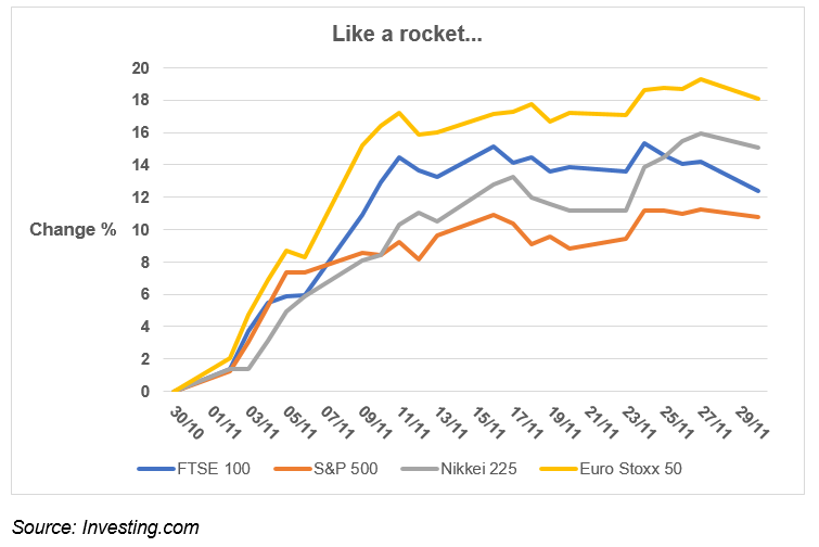 November was an exhilarating month on the world’s stock markets, as the graph above illustrates. It cannot be said that many experts – bar room or otherwise – expected it look like this.
