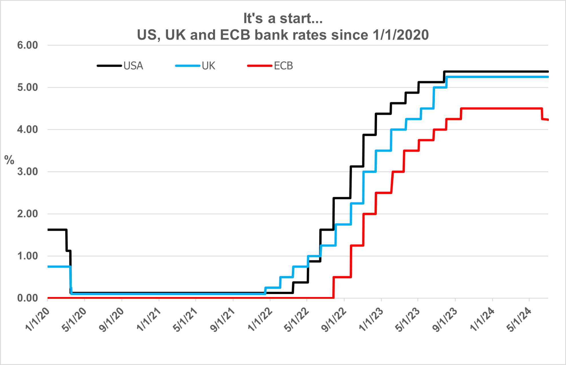 On June 6, 2024, the European Central Bank (ECB) became the first of the major central banks (the big three being the US, UK, and Europe) to announce an interest rate cut in the current cycle. This marked the ECB’s first reduction since September 2019, when its main rate was lowered to -0.5%. ECB President Christine Lagarde had hinted at a June cut for some time, so the move was anticipated. However, she has been more cautious about future rate reductions, indicating that June’s cut may not signal the beginning of a series of regular cuts at each meeting.