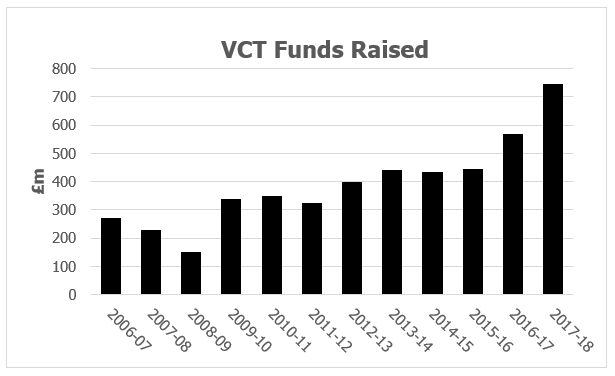 VCTs have been growing in popularity in recent years, as the graph shows. Nearly £750 million was invested in VCTs in 2017/18, the highest figure since 2005/06, when the rate of income tax relief was temporarily boosted to 40% (against the current 30%).