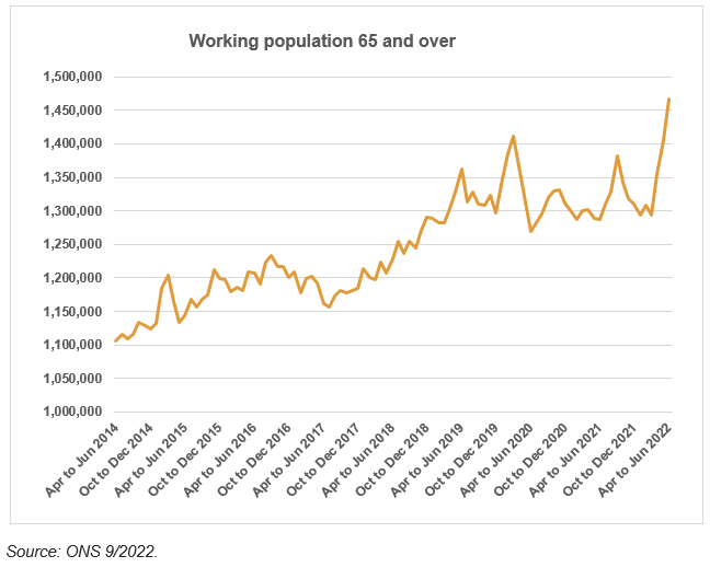 The combination of sharply rising inflation and the increase in state pension age to 66 is likely to be forcing some former retirees back into work to make ends meet. It does not help that the April 2022 increase in the state pension was 3.1%, less than a third the current (August) rate of CPI inflation.