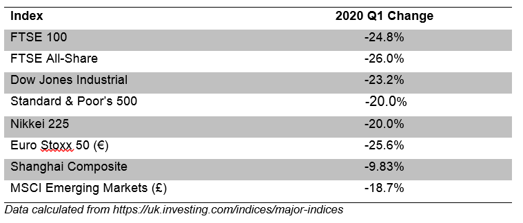 The quarterly performance of both the UK FTSE 100 and US Dow Jones Index was the worst since the final quarter of 1987 (when the UK experienced the Great Storm). No major markets escaped the impact of the virus, with most entering what the pundits label as bear market territory – a fall of 20% or more. Ironically, one of the best performing markets was China, where the Shanghai Composite fell less than 10%.