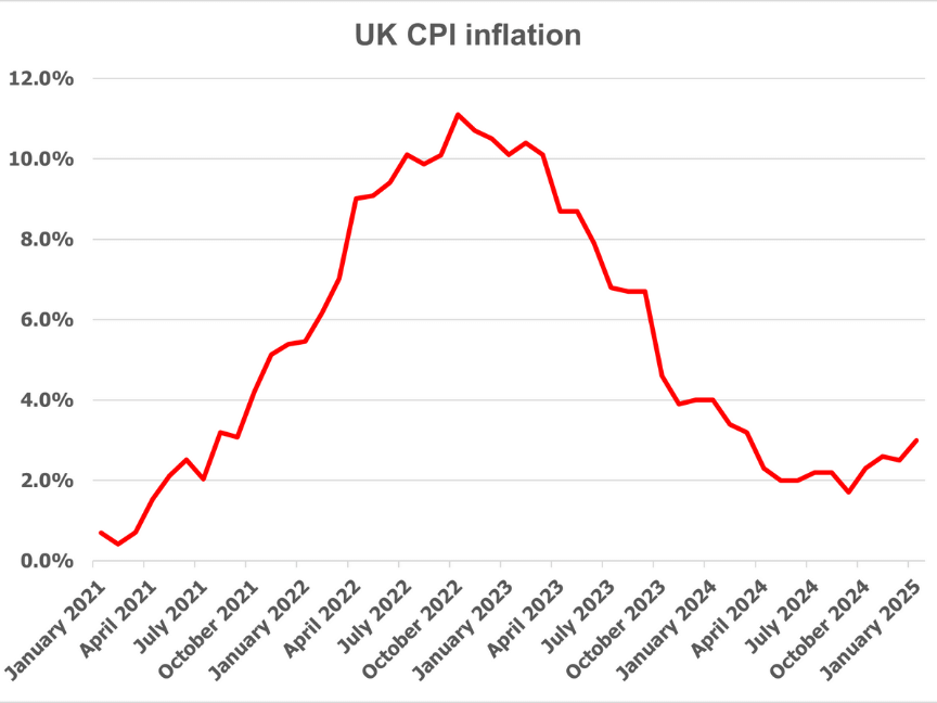 - Just under a fortnight later, the Office for National Statistics revealed the January CPI annual rate was 3.0%, 0.5% higher than in December 2024 and more than analysts had expected.