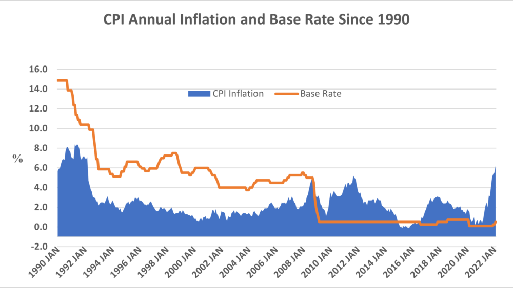 So far, the Bank of England has raised interest rates in 0.25% steps. Its ability to increase rates is constrained by the weak growth prospects for the UK economy, which could be tipped into a recession if rates reverted to those before 2008, yet alone in the early 1990s, the last time inflation was as high.