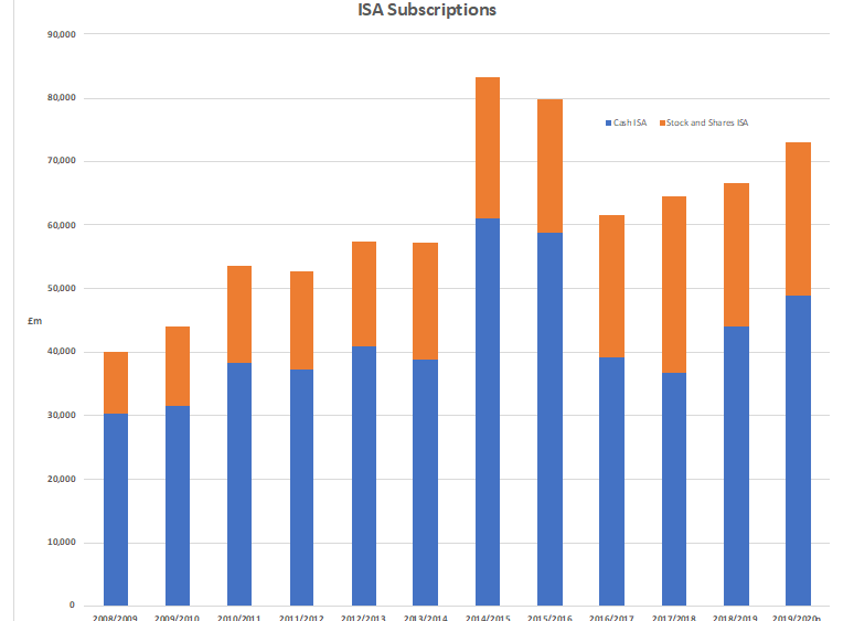 • Despite ultra-low interest rates, the amount of money invested in cash ISAs has continued to grow. In 2019/20, £48.75 billion of subscriptions were received, more than twice as much as was invested in stocks and shares ISAs.