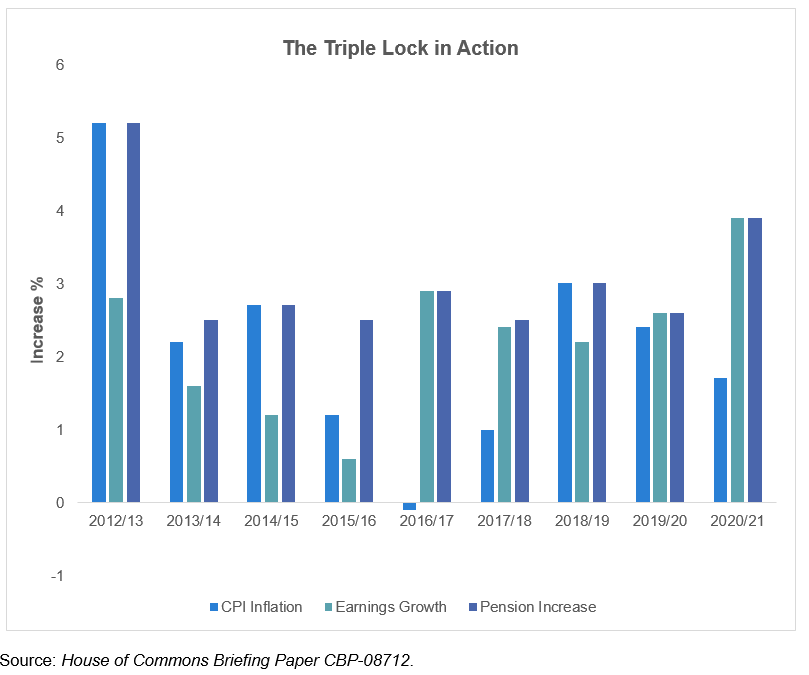 The Triple Lock is a feature that the main political parties pledged to maintain in their 2019 election manifestos, but despite political promises, the Triple Lock has no legal standing. The law governing increases to the BSP and NSP is based on earnings growth. Earnings growth applies to the April 2020 increases (of 3.9%), but in years when it does not take the top slot, the government overrides the statutory rules.
