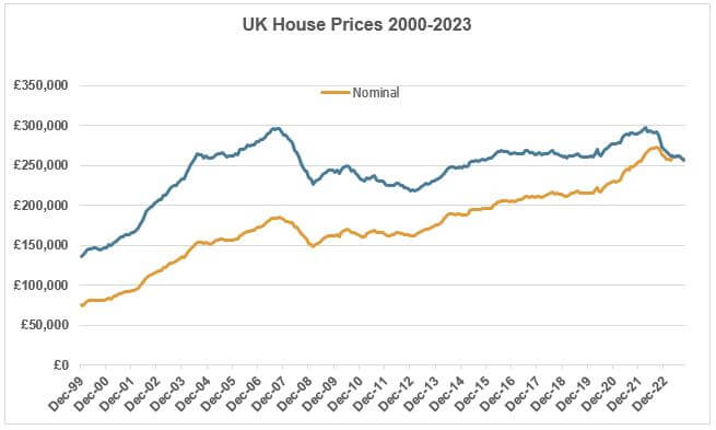 The graph above shows Nationwide’s figures from January 2000 to September 2023. The blue line is more commonly seen and shows the average house price figure since the turn of the century. The orange line is an inflation adjusted version of the blue line, showing how real property prices have grown. This has a much steeper final drop than the blue line because of the recent burst in inflation. It also illustrates a fact that does not make many commentaries about house prices – the average real price today is virtually unchanged from 15 years ago…